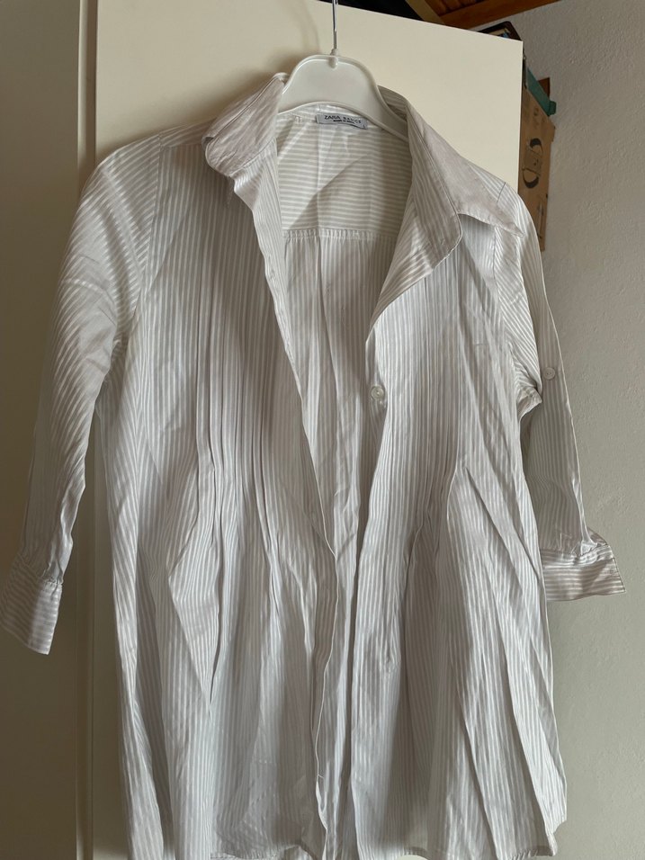 Beyaz keten kumaştan, pileli ve yakalı uzun kollu gömlek. Normal uzunlukta ve regular fit, ofis için uygun Paris tarzı bir tasarım.