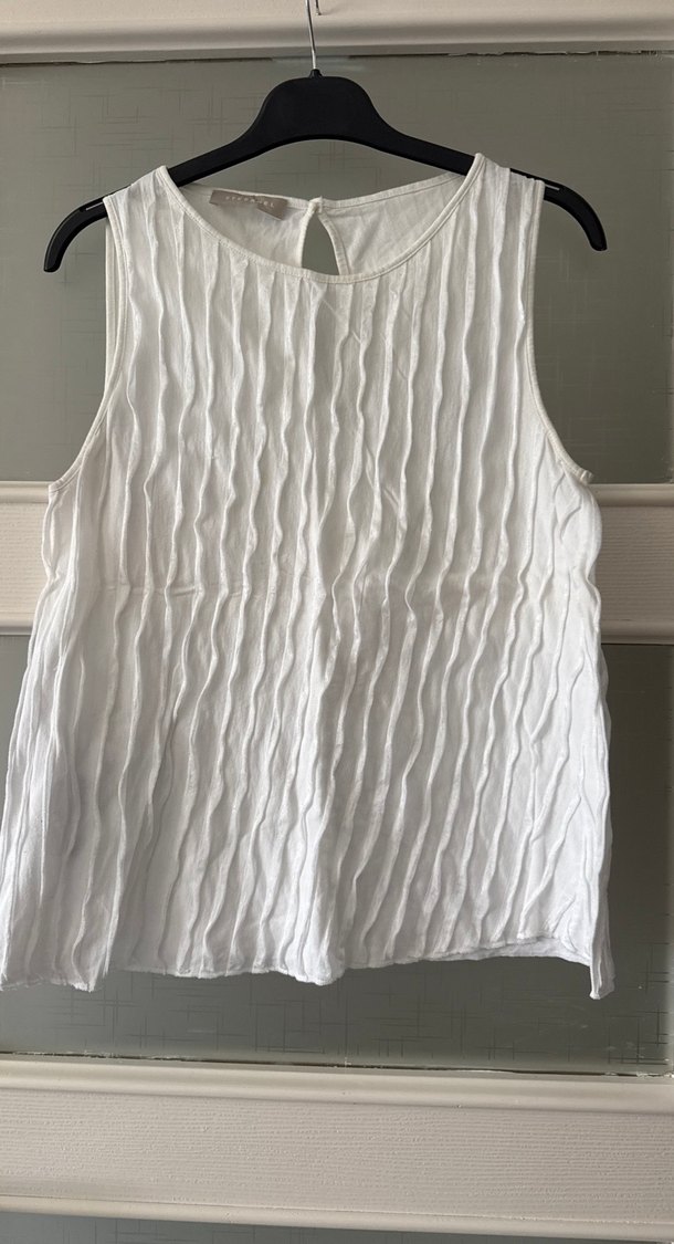 Keten kumaştan, kolsuz, pilili ve tek renk beyaz bluz. Salaş kesimi ve tekne yaka detayı ile minimalist bohem tarzı için uygundur.