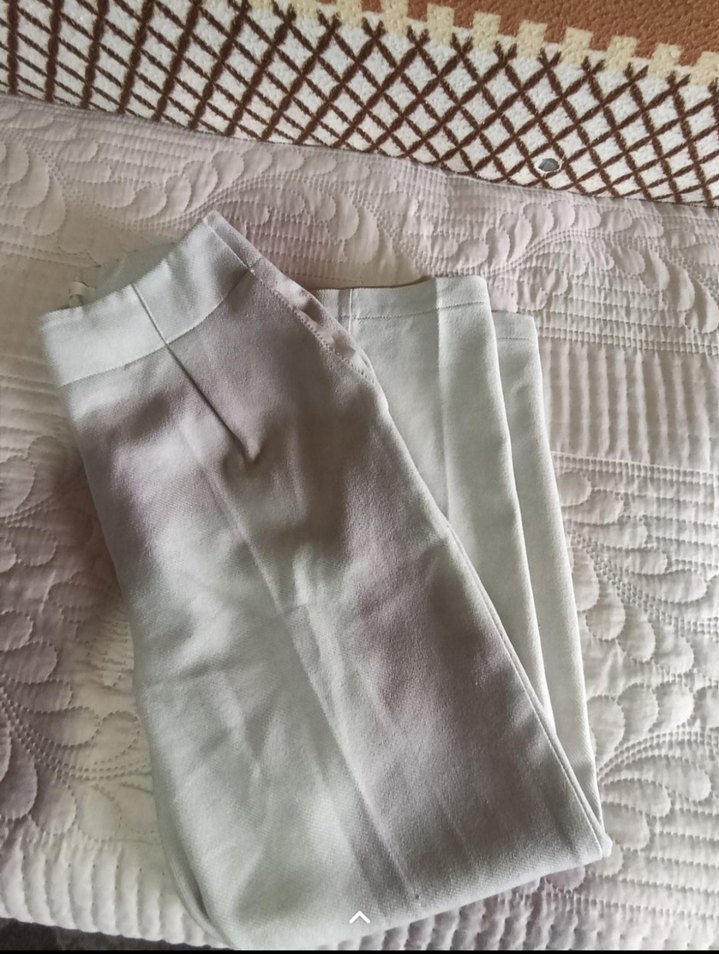 Kadın beyaz keten pantolon, normal kesim ve pilili tasarıma sahiptir. Midi boyda, minimalist ve normcore tarzıyla ofis için uygundur.