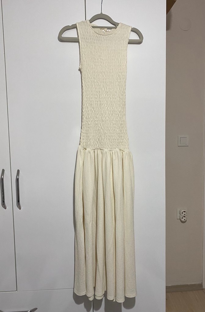 Keten kumaştan, kolsuz, yüksek yakalı ve pilili uzun etekli beyaz elbise. Minimalist bohem tarz için uygun, vücuda oturan kesime sahip.