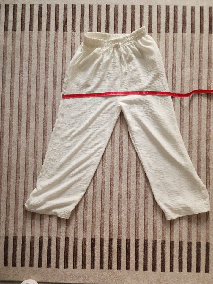 Kadınlar için beyaz keten, rahat kesim ve lastikli bel bandına sahip pantolon. Normal midi boyda, minimalist ve sade tarzda, günlük kullanıma uygun.