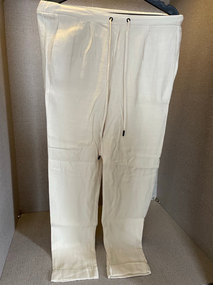 Beyaz keten kumaştan, rahat kesim ve midi boy pantolon. Belinde bağcık detayıyla şık ve rahat bir görünüm sunar. Günlük kullanım için uygundur.