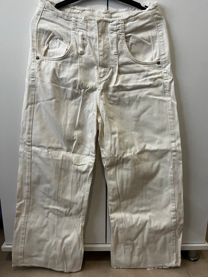 Beyaz keten kumaştan, midi boy ve bol kesim kadın pantolonu. Günlük kullanıma uygun, rahat ve normcore tarzda, zahmetsiz şıklık sunar.