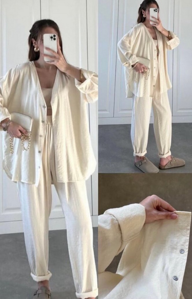 Kadın Beyaz Keten Rahat Kesim Takım