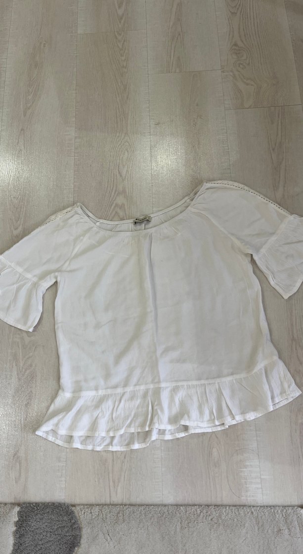 Kadın beyaz keten kumaştan, kısa kollu, kayık yaka ve etek ile kollarda fırfır detaylı, rahat kesim bohem tarzda bluz, günlük kullanım için uygun.