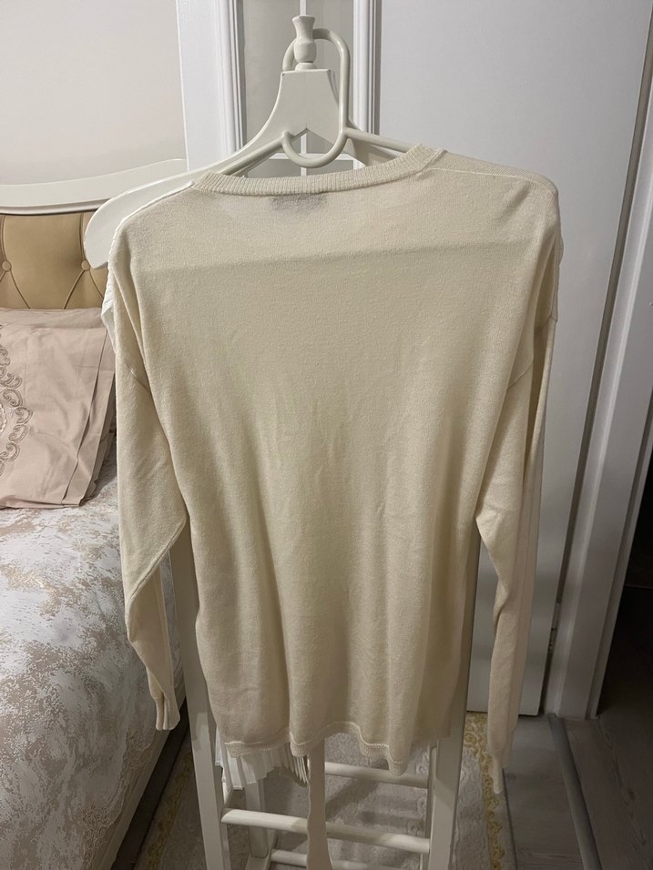 Beyaz keten kumaştan, yuvarlak yakalı ve uzun kollu salaş kesim bohem tarzda kadın trikosudur. ✨