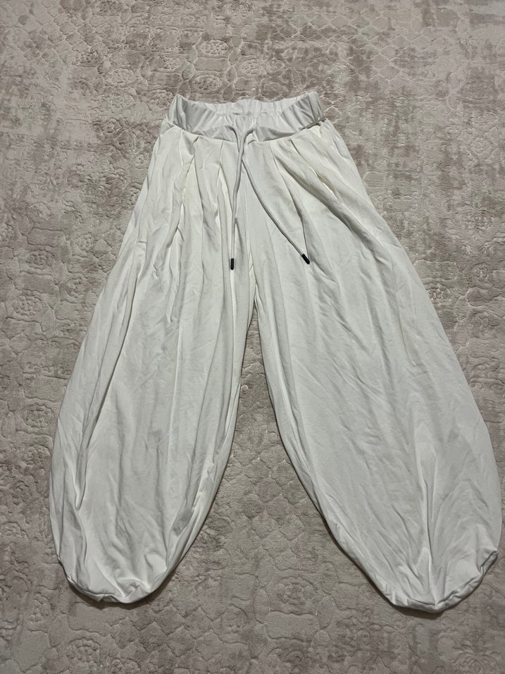 Beyaz penye kumaştan, salaş kesim ve midi boyda, elastik bel bantlı kadın pantolon, rahat ve şık bir tarz sunar.