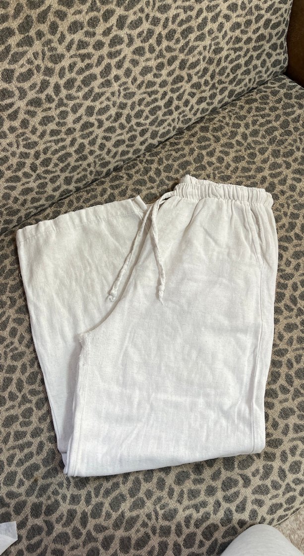 Beyaz keten, salaş kesim, midi boy, lastikli ve bağcıklı bel detaylı kadın pantolonu. Günlük kullanıma uygun, bohem tarzda.