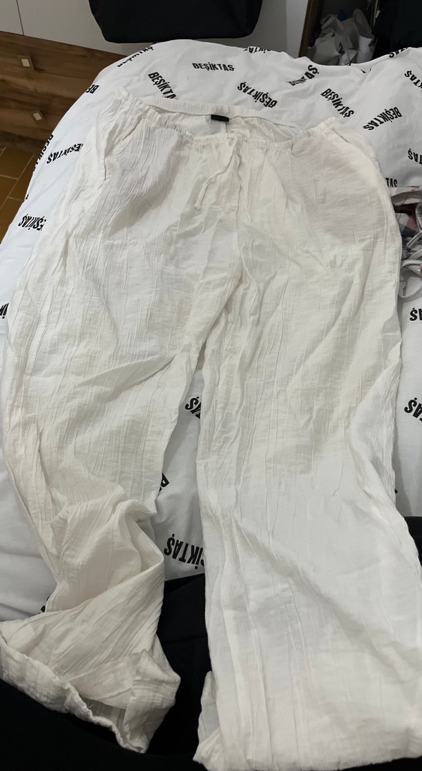Beyaz keten kumaştan, salaş ve drapeli kesime sahip midi boy pantolon, minimal ve bohem tarzı yansıtır.