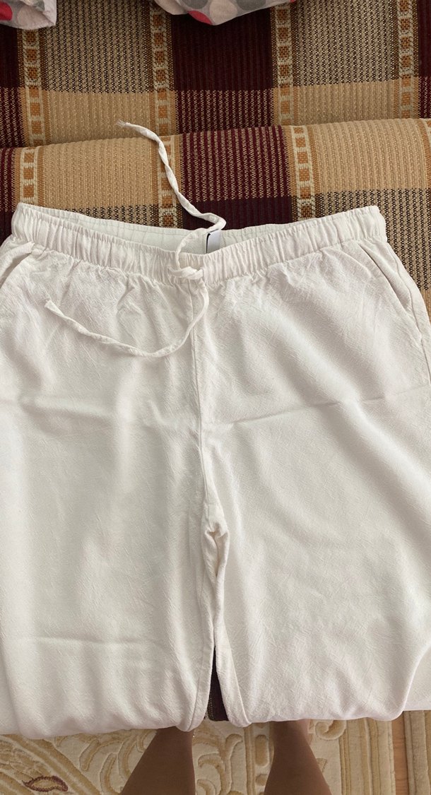 Beyaz keten, salaş kesim, bağcıklı bel, midi boy, minimal ve bohem tarzda pantolon. Günlük kullanıma uygun, yumuşak pastel tonlarda.
