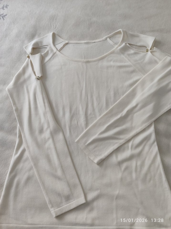 Beyaz renkli, keten dokulu, salaş kesim uzun kollu kadın kazak. Minimalist tasarımı ve omuz detayları ile günlük kullanıma uygundur.