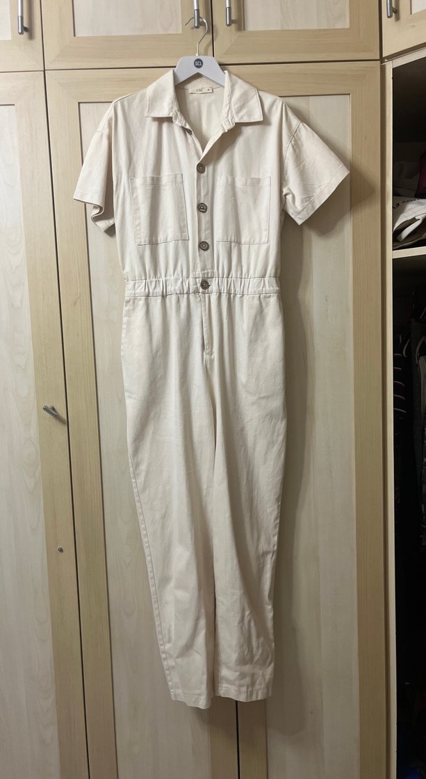 Kadın beyaz keten midi tulum, kısa kollu, düğmeli ve notch yaka detaylıdır. Cebinde ufak bir leke var.