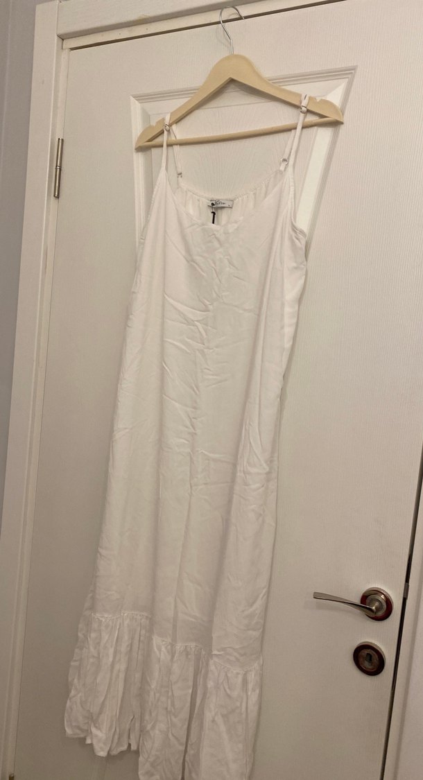 Keten kumaştan, askılı beyaz uzun elbise, bol kesim ve straplez yaka ile sade ve bohem tarzda günlük kullanım için uygun.