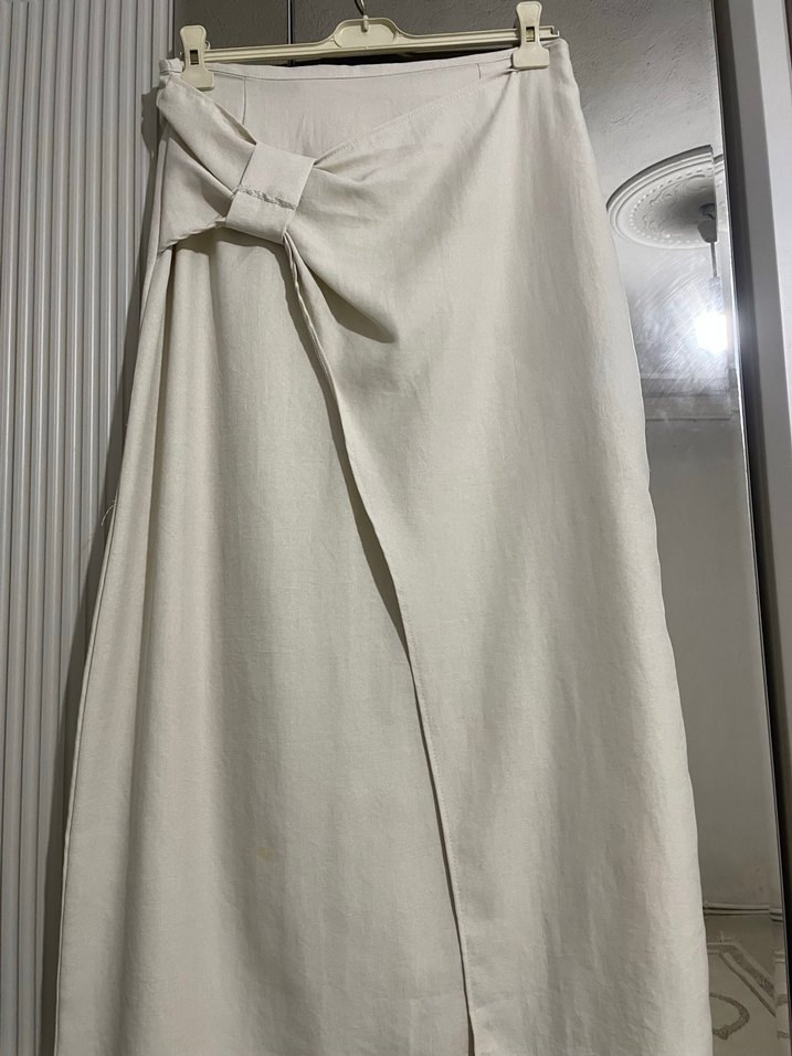 Kadınlar için krem renkte, yumuşak keten kumaştan yapılmış uzun drapeli etek. Minimalist ve bohem tarzıyla günlük kullanıma uygundur. 1 defa giyildi küçük lekesi var yıkayınca geçer