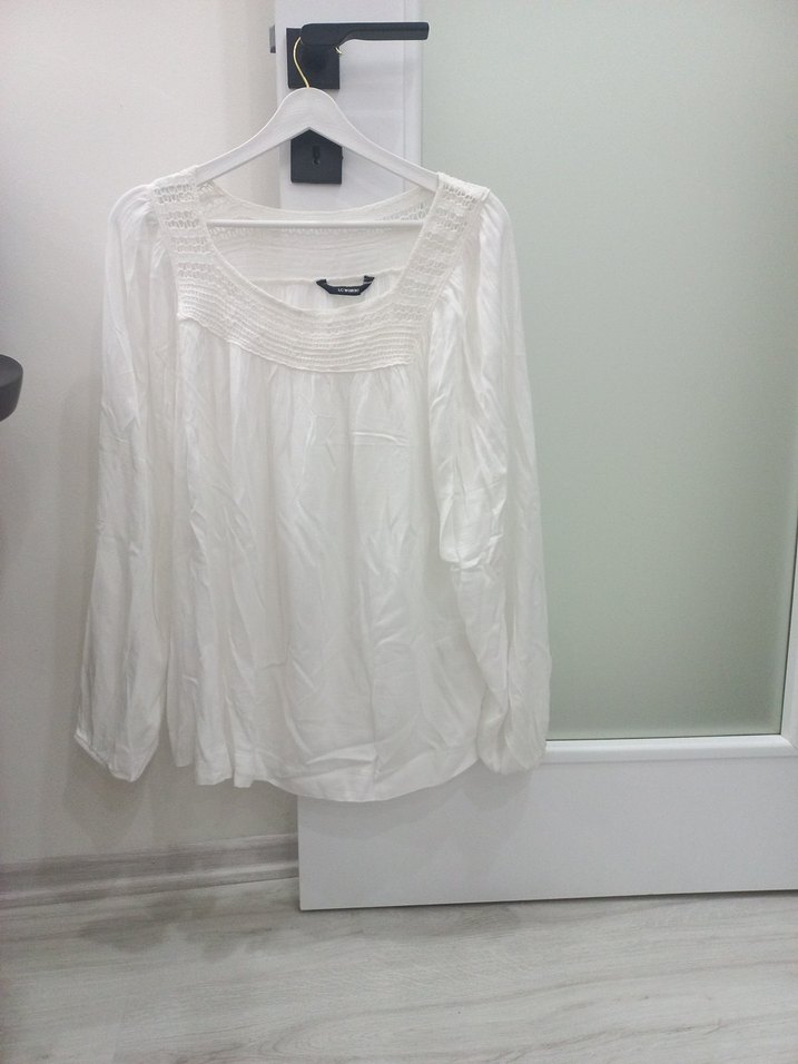 Beyaz keten bluz, tekne yaka ve uzun kollu, salaş kesimle bohem ve minimalist tarz sunar. Günlük kullanıma uygundur. hiç kullanmadım