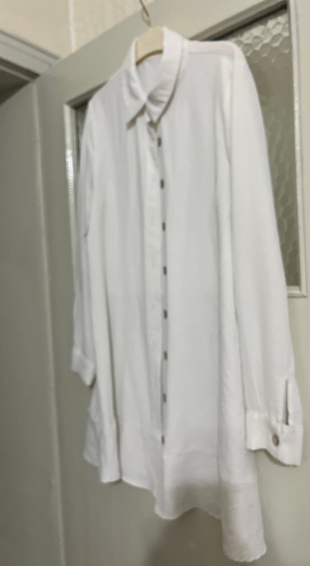 Kadınlar için keten kumaştan, yakalı ve düğmeli, uzun kollu, salaş kesim ve midi uzunlukta beyaz gömlek. Minimalist ve normcore tarzda, günlük kullanıma uygun.