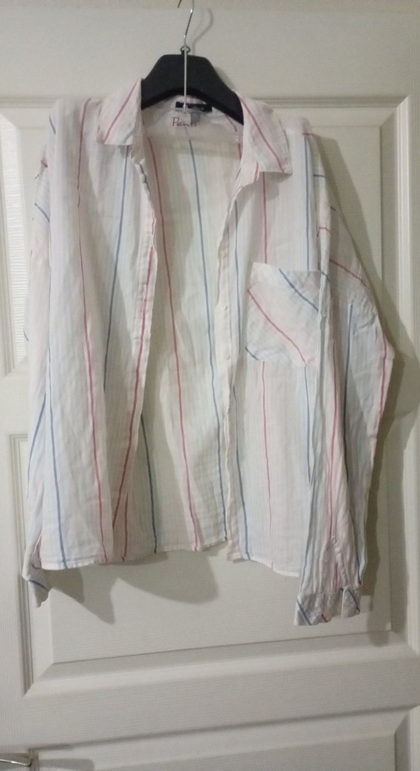 Gevşek kesim beyaz keten gömlek, uzun kollu ve düğmeli. Notlu yaka ve pastel çizgilerle gündelik kullanıma uygun.