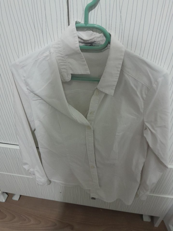 Beyaz keten, yakalı ve düğmeli uzun kollu gömlek. Normal midi boyda, desen içermeyen sade tasarıma sahiptir. Ofis kullanımı için uygundur.