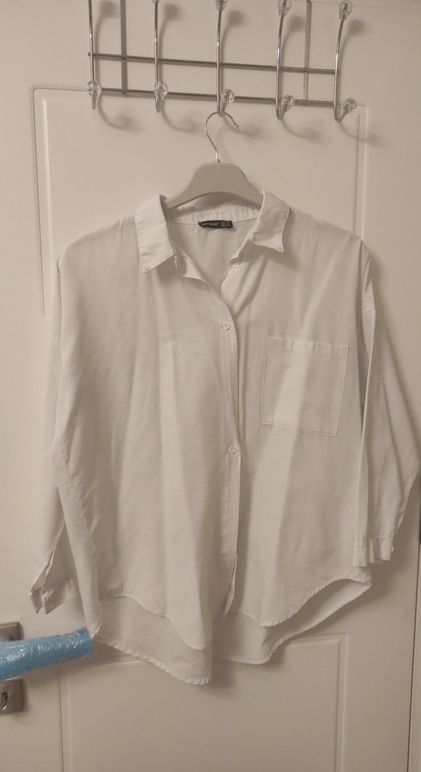 Salaş kesim, uzun kollu beyaz keten gömlek. Düğmeli ve yakalı, ön cepli, günlük rahat kullanıma uygun.
