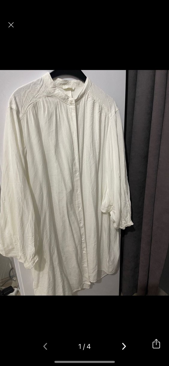 Yumuşak keten kumaştan, beyaz renkte, bol kesim kadın gömlek. Yüksek yakalı, düğmeli ve uzun kolludur. Minimalist bohem tarzda, günlük kullanıma uygun.