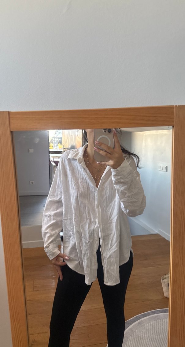 Beyaz keten kumaştan, yakalı ve uzun kollu, salaş kesim rahat bir kadın gömleği. Minimalist ve şık, günlük kullanım için ideal midi boyda.