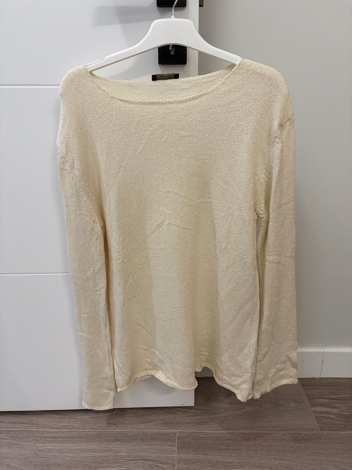 Beyaz renkli, keten kumaştan, uzun kollu ve salaş kesime sahip, günlük kullanıma uygun sade kazak. Rahat ve şık görünüm sunar. Defosu yoktur, salaş bir tarzdır, plaj için bile uygundur. M L beden uyumludur salaş seven small bedenler de tercih edebilir