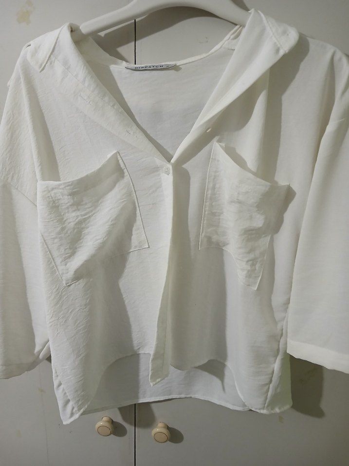 Kadınlar için hafif beyaz keten kumaştan, V yakalı ve kısa kollu, düğmeli, rahat kesimli gömlek. Önünde iki cep bulunur, günlük kullanım için uygundur.