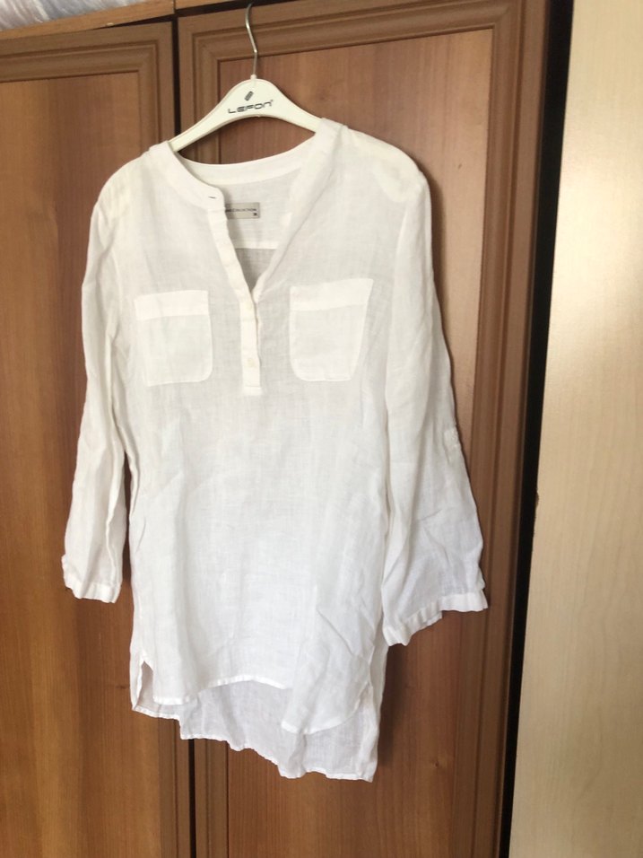 Bol kesim beyaz keten gömlek, uzun kollu ve V yakalı. Düğme detaylı, minimalist ve bohem tarzda, günlük kullanım için uygun.