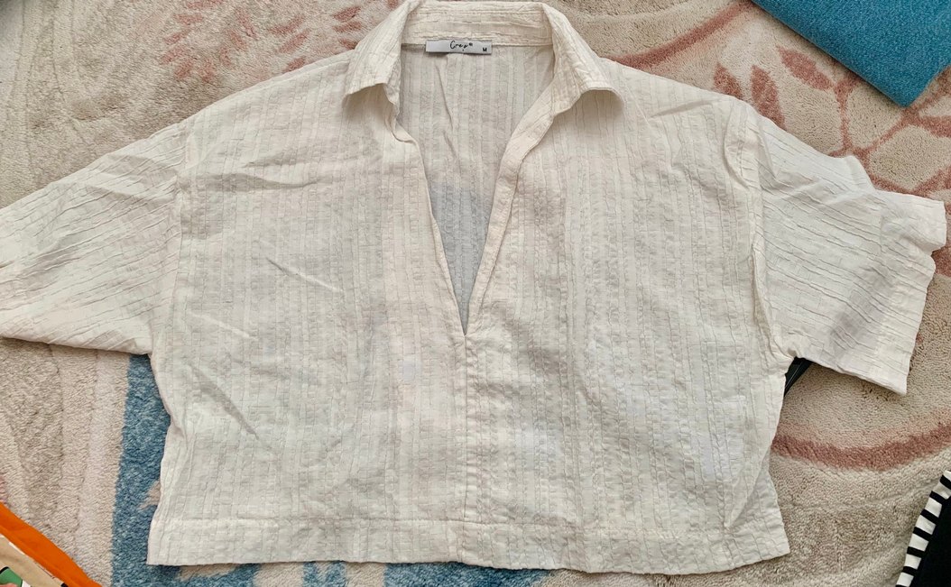Bol kesim beyaz keten gömlek, V yaka ve düğmeli, kısa kollu, minimalist bohem tarzda. Günlük kullanıma uygundur. Defosu yok