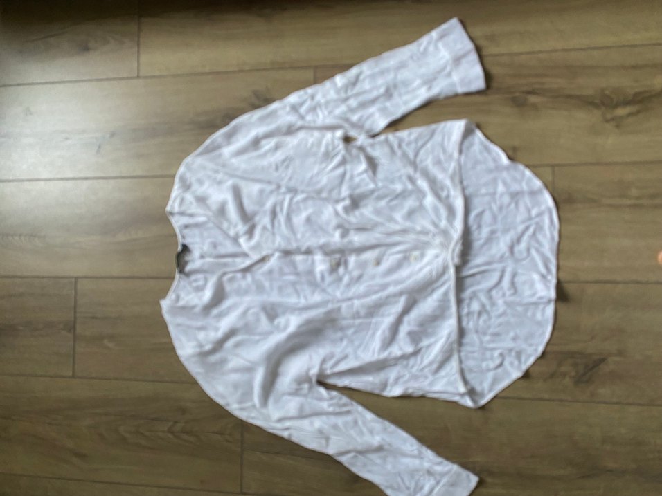 Bol kesim, uzun kollu beyaz keten gömlek. V yaka ve düğmeli, normal boyda, minimalist tarzda.