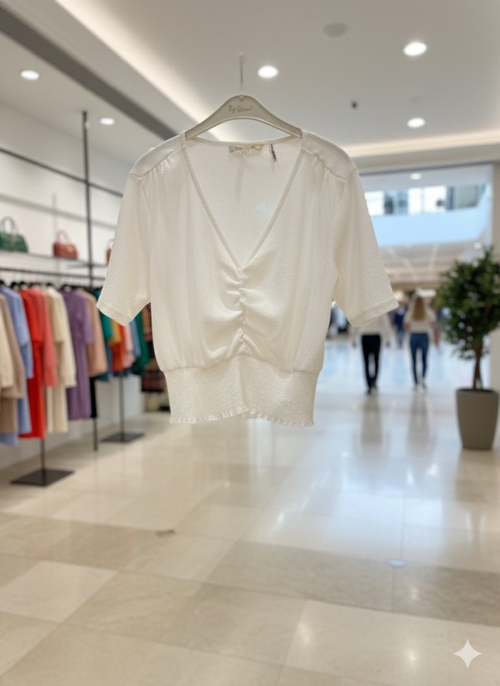 Kadınlar için keten kumaştan yapılmış, V yakalı ve kısa kollu, bol kesim beyaz bluz. Ön kısmında büzgülü detay ve kısa boy ile sade şıklık sunar.