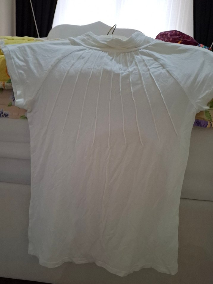 Kadın beyaz bluz , kısa kollu, V yakalı ve pileli detaylara sahip. Rahat kesim ve midi boyda, günlük sokak stiline uygun minimal tasarım.