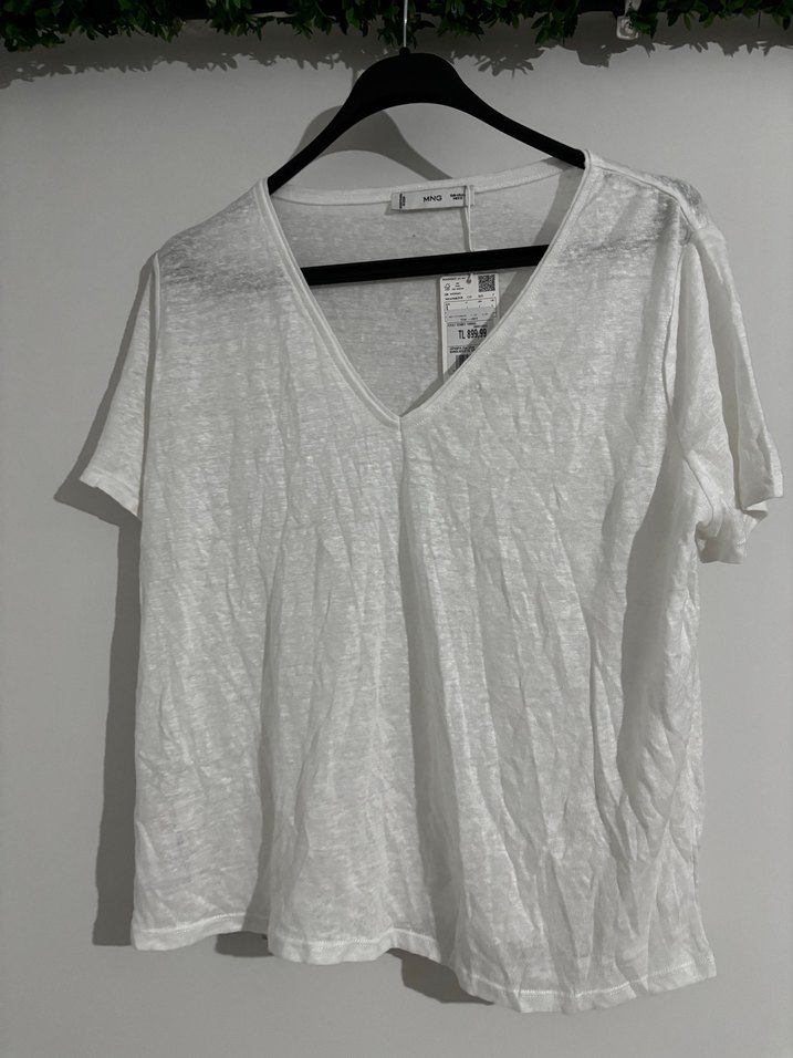 Kadın Beyaz Keten V Yaka Kısa Kollu Tişört Mango