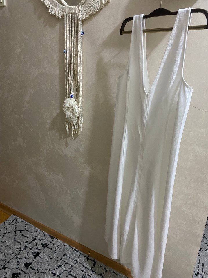 V yaka, kolsuz, drapeli beyaz keten midi elbise. Minimalist ve şık tasarımıyla günlük kullanıma uygundur.