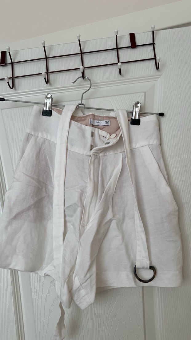 Yumuşak keten kumaştan yapılmış, kemerli ve bol kesimli beyaz kadın şort. Mini boyu ve minimalist tasarımıyla bohem stiline uygundur.