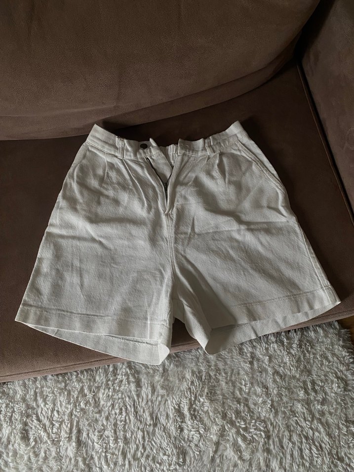 Kadınlar için beyaz keten yüksek bel mini şort, yumuşak kumaş ve bol kesimle günlük kullanıma uygun sade ve şık tarz sunar.