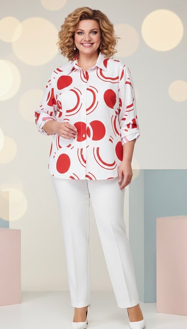 Beyaz üzerine kırmızı daire desenli, uzun kollu, ve düğmeli kadın gömlek. Günlük iş kullanımı için rahat kesim ve sentetik kumaştan.