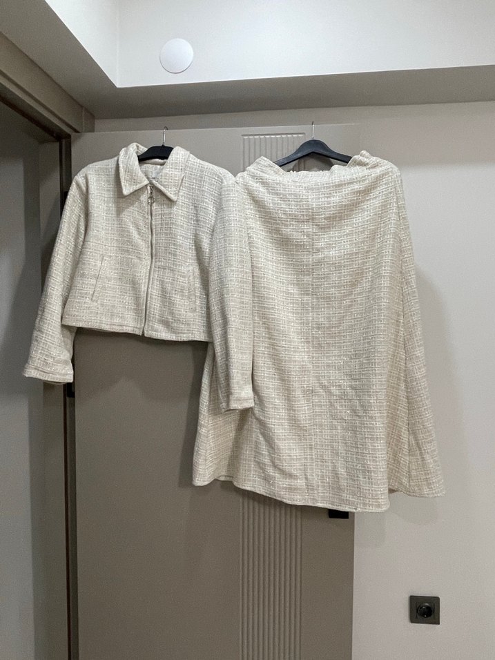Kadınlar için beyaz kısa ceket ve uyumlu etekten oluşan takım. Uzun kollu, regular fit ve dokulu kumaştan yapılmıştır. Günlük kullanım için sade ve desensiz tasarım.