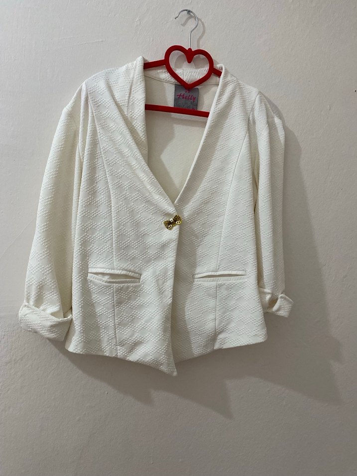 Pamuk kumaştan, beyaz kısa uzun kollu blazer ceket. Düğmeli, yaka detaylı, ofis veya günlük kullanıma uygun.