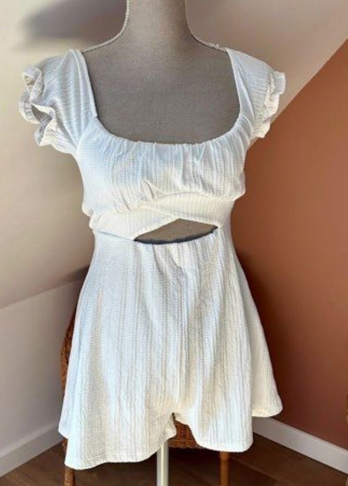 Beyaz kısa tulum, fırfırlı kolları, kesik detaylı bel kısmı ve yumuşak keten dokusuyla günlük kullanıma uygun bohem tarz sunar Zara marka etiketli