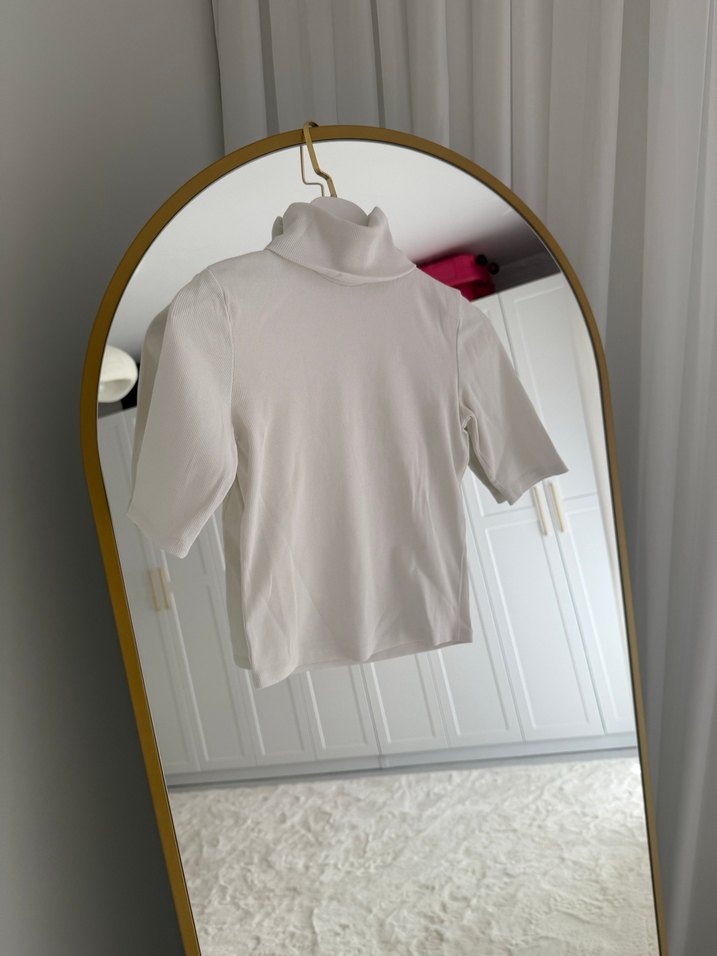 Pamuk kumaştan üretilmiş, balıkçı yaka ve kısa kollu, kadınlar için beyaz ve vücuda oturan tişört. Midi uzunlukta, desen içermeyen sade tasarım, günlük sokak stili için uygun, rahat ve şık.