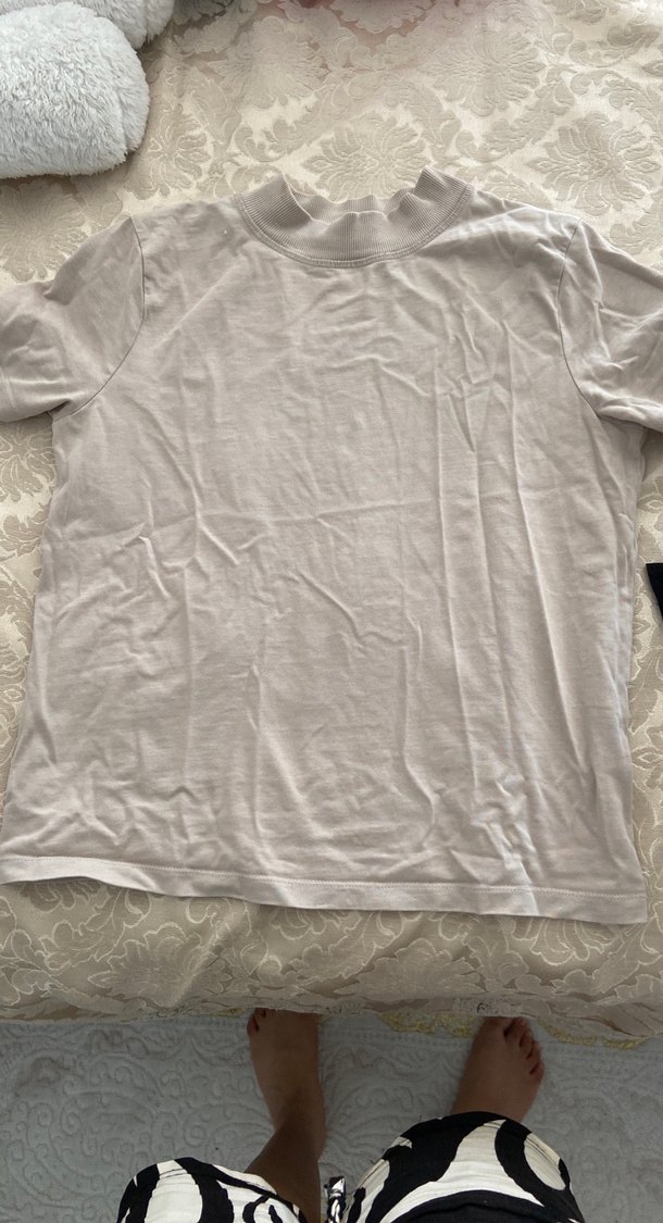 Kadınlar için beyaz renkte, kısa kollu ve bisiklet yaka tişört. Yumuşak keten kumaştan, rahat kesim ve normal boyda. Günlük sokak stili için uygundur.