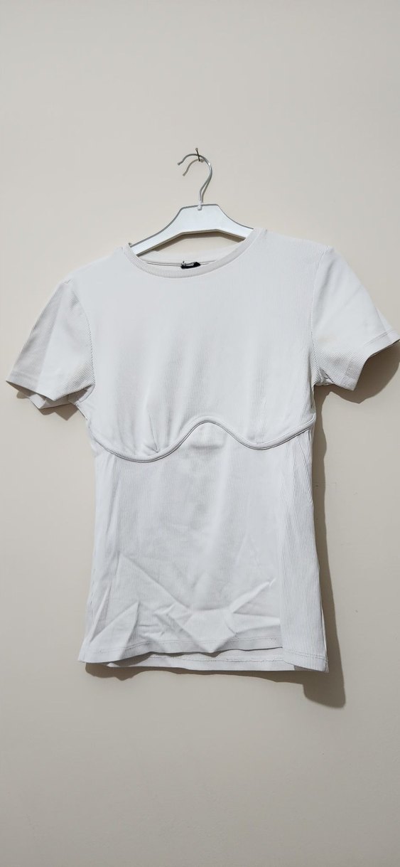 Kısa kollu, bisiklet yaka, beyaz basic kadın tişört. Minimalist ve desensiz, günlük kullanım için uygun.