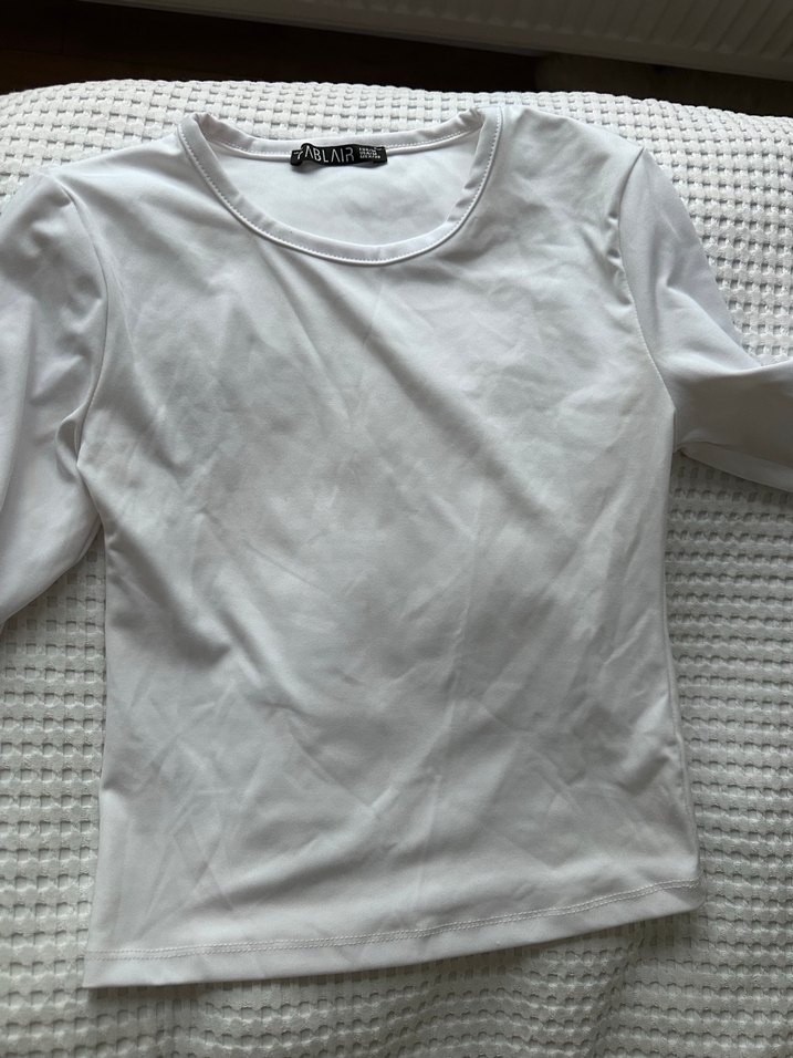 Kısa kollu, bisiklet yaka ve keten kumaştan yapılmış beyaz, vücuda oturan crop top. Günlük kullanıma uygun sade ve minimalist tarzda.