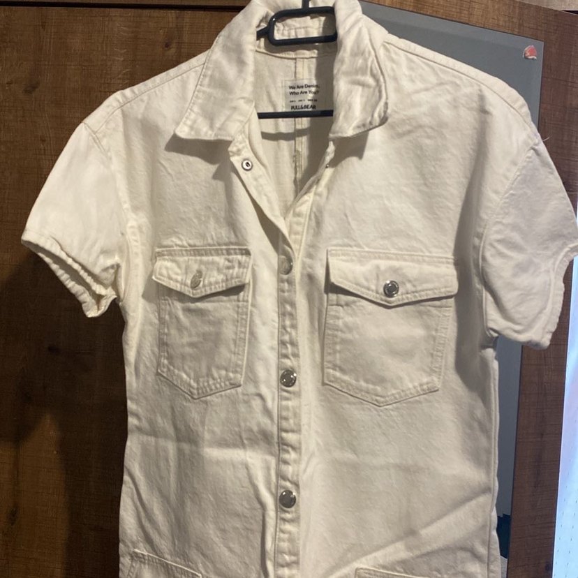 Pamuk kumaştan beyaz kısa kollu, düğmeli ve yakalı kot tulum. İki ön cepli, rahat kesim, günlük sokak stili için uygun.