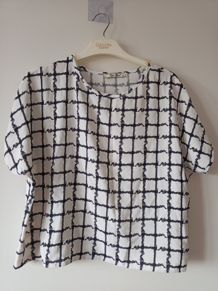 Kadınlar için kısa kollu, bol kesim, yuvarlak yakalı pamuklu kumaştan yapılmış beyaz ve gri kareli bluz. Düğme detaylı, günlük kullanıma uygun.