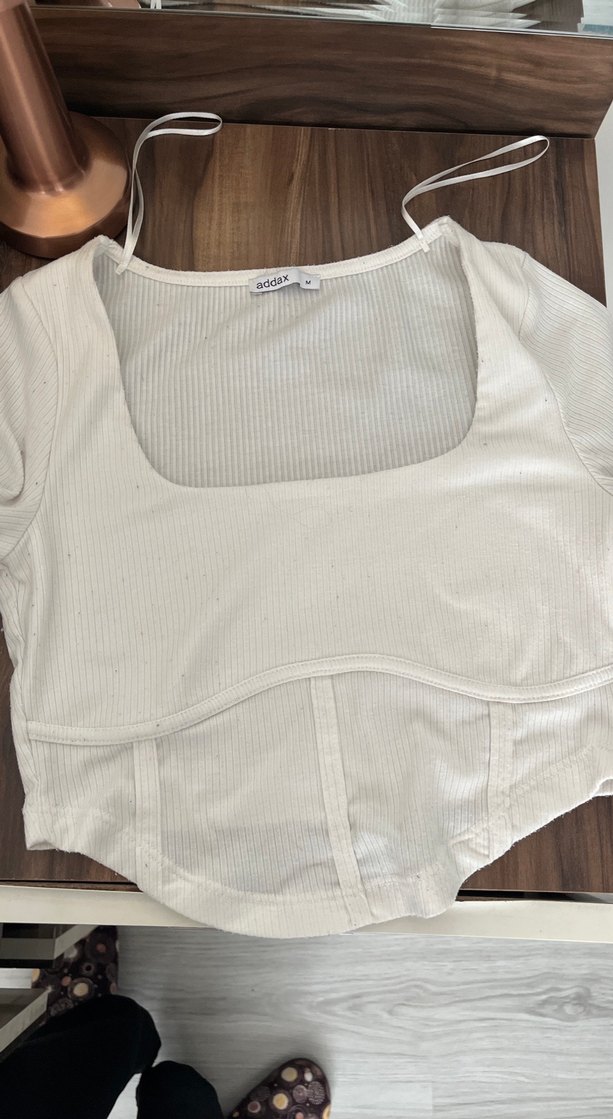 Kadın beyaz keten bluz, tek renk, kısa kollu ve tekne yaka kesimiyle şık ve rahat bir görünüm sunar. Mini boyda ve vücuda oturan kesimiyle gündelik kullanıma uygundur.