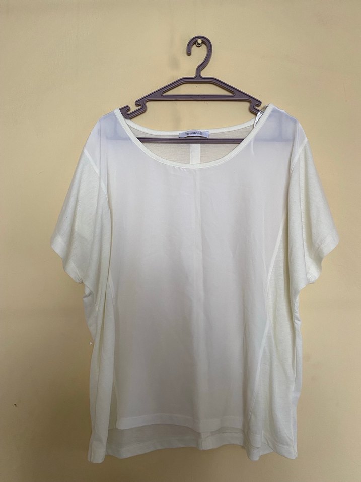 Beyaz, kısa kollu, yuvarlak yakalı ve bol kesim keten kumaştan yapılmış bluz. Minimalist ve sade tarzda, günlük kullanıma uygun.
