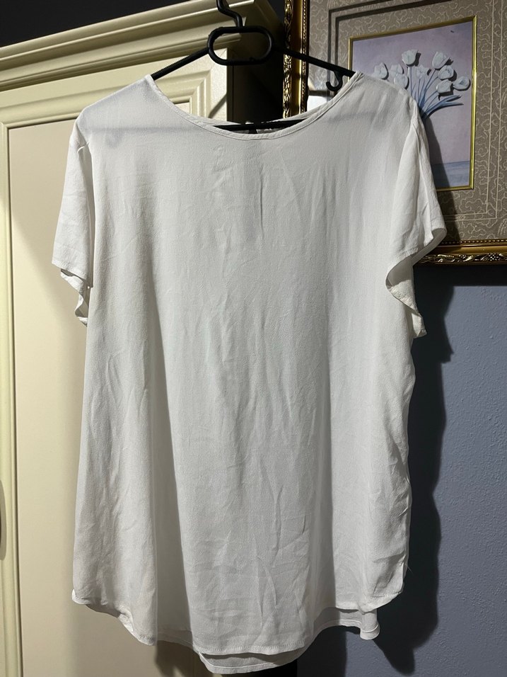 Kadınlar için kısa kollu, yuvarlak yakalı beyaz keten tişört. Rahat kesimi ve normal boyuyla günlük sokak stiline uygun minimalist tasarım. Bir kere giyildi sadece