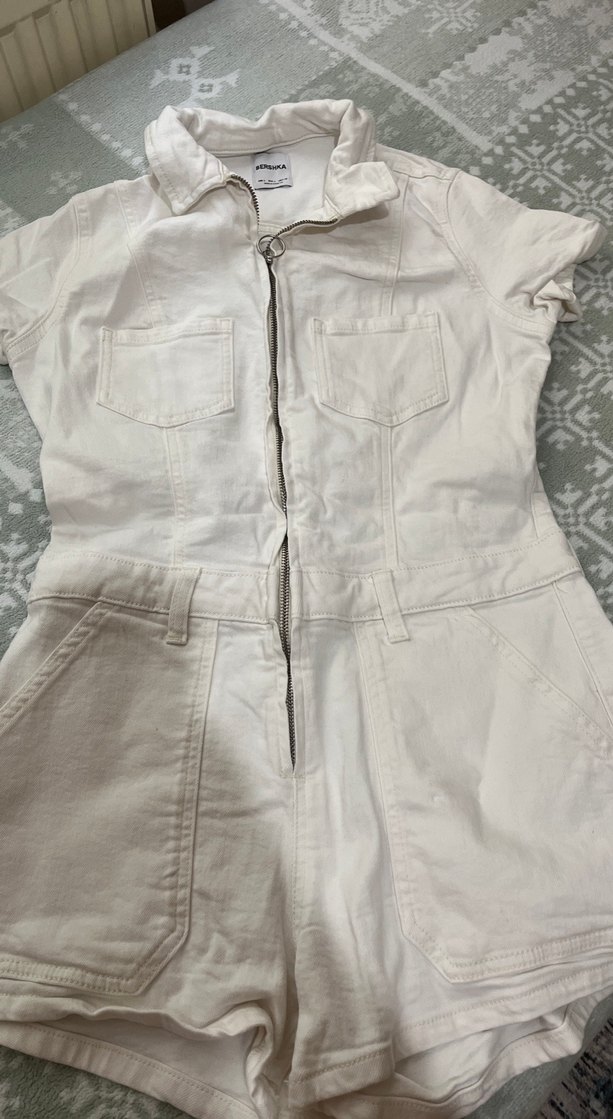 Kadınlar için beyaz keten kısa kollu, düğmeli, yakalı, cepli ve dar kesim tulum. Rahat sokak stili için uygundur.